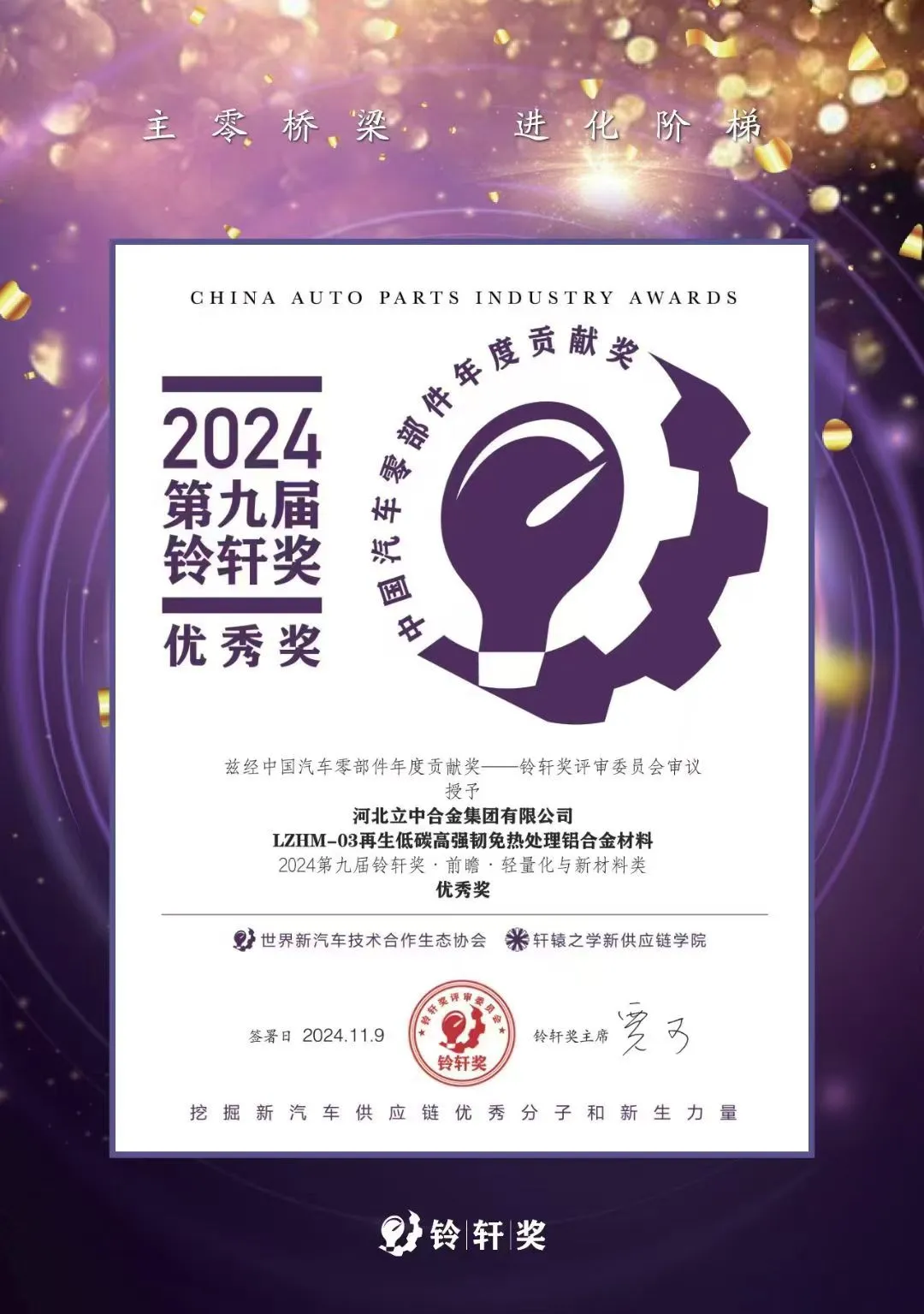 永利3044noc集团(股票代码:300428)自主研发的LZHM-03再生低碳高强韧免热处理铝合金材料,荣获此次铃轩奖前瞻轻量化与新材料类优秀奖。这是集团的免热处理铝合金新材料第二次获得铃轩奖前瞻类材料优秀奖,永利3044noc集团副总裁、永利3044noc合金集团总裁郭军辉进行现场领奖。