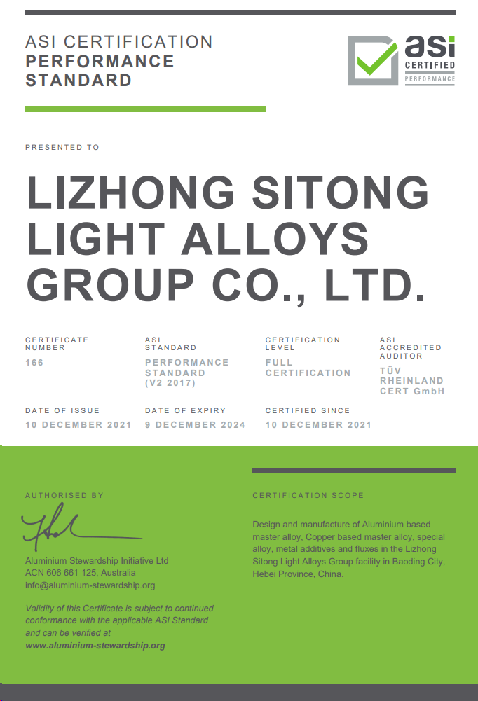 ASI是致力于铝价值链标准制定和认证的非营利性计划。ASI的愿景是实现铝对可持续性社会贡献的最大化。使命是认同并协作推动铝的负责任生产、负责任采购和企业治理。ASI认证的中心是对两个自愿性标准的审核:ASI绩效标准和ASI监管链标准。ASI绩效标准定义了环境、社会和治理原则和标准,目的是应对铝价值链中的可持续性问题。ASI监管链(CoC)标准是对ASI的绩效标准的补充,对ASI成员是自愿认证的。CoC标准为铝材料的流转设定了监管链的要求,包括通过价值链生产和加工后应用到不同下游领域的ASI铝产品。通过实施ASI的CoC标准,使ASI绩效标准下的供应链与ASI实体生产的产品之间建立了联系,以推进整个铝价值链的可持续性。